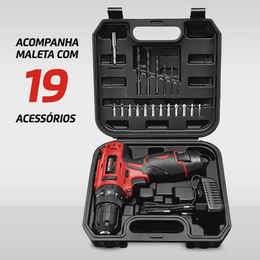 ACOMPANHA MALETA COM ACESSÓRIOS - Fácil de armazenar e transportar e ainda possui 19 acessórios essenciais para furar e parafusar (12 Bits, 06 Brocas indicadas para aço, 1 Prolongador).