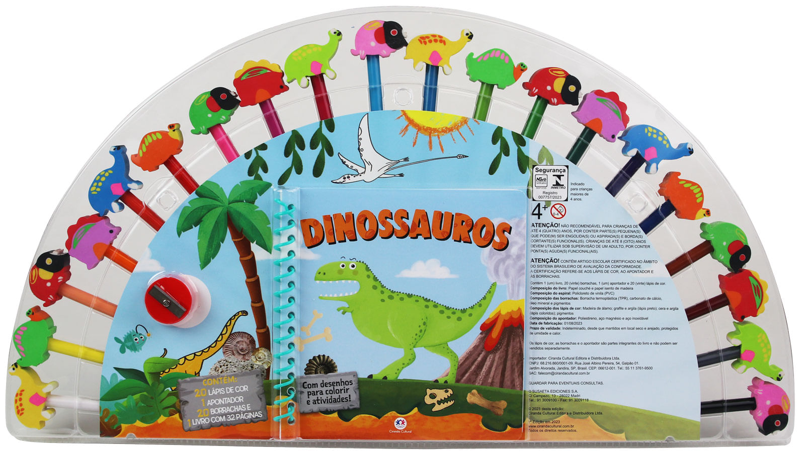 Divirta-se a valer com este kit de colorir! Além de um livro cheio de dinossauros para colorir e de atividades, você vai encontrar lápis de cor, borrachas coloridas e em formato de dinossauros, e um apontador! Não é demais?