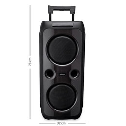 Com estrutura de carrinho, ela é praticamente um carro de som, pra você levar na maior praticidade pra casa de praia, festa de amigos ou mesmo circular entre os cômodos de casa. E além disso, tem controle remoto, pra você dar os comandos de onde estiver, sem precisar parar de dançar ou curtir o momento. Incrível, né?